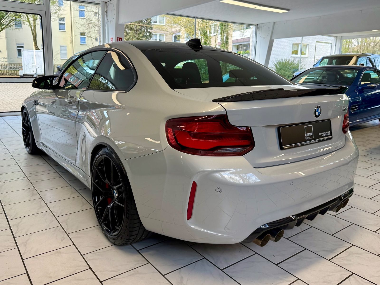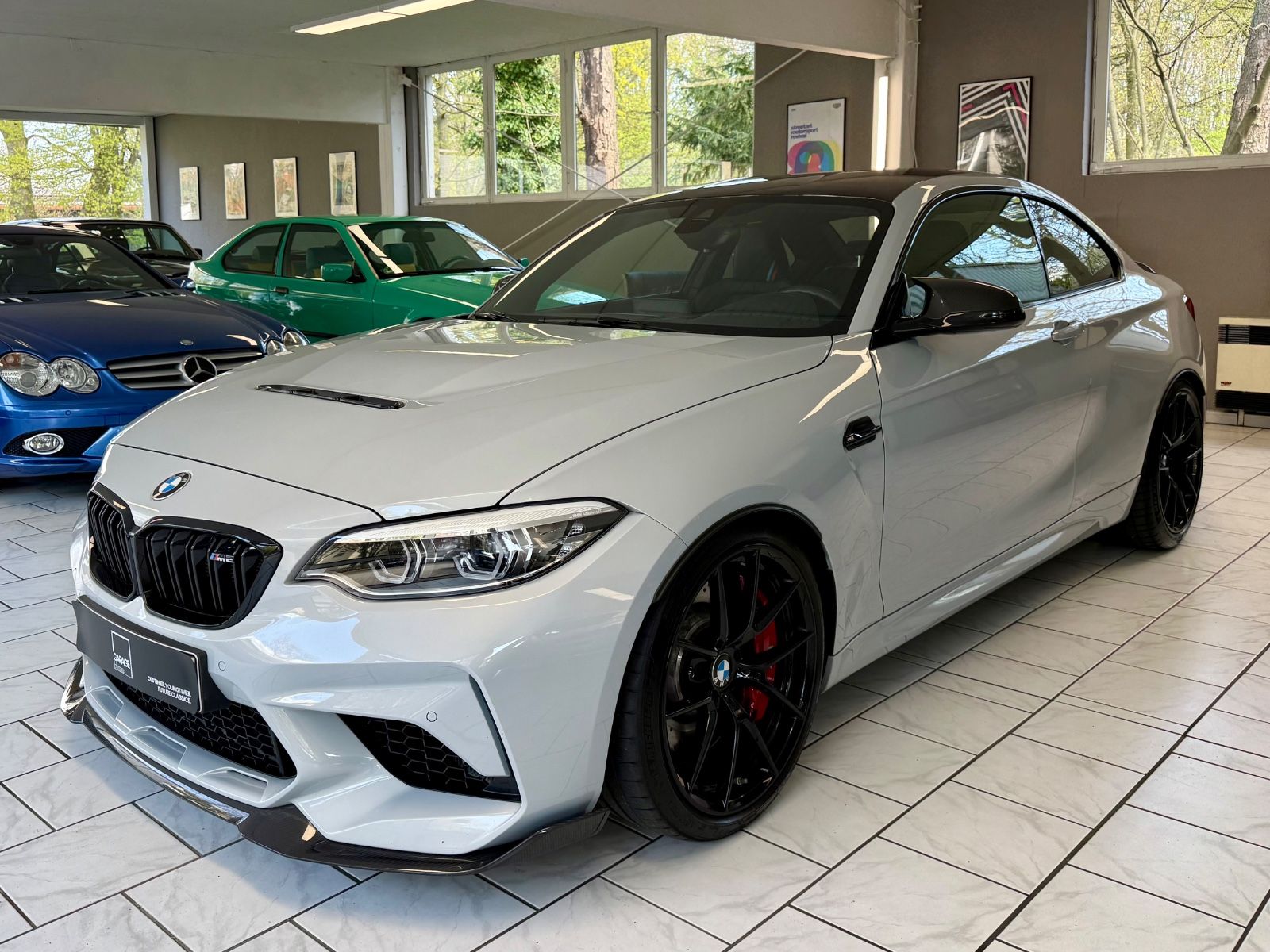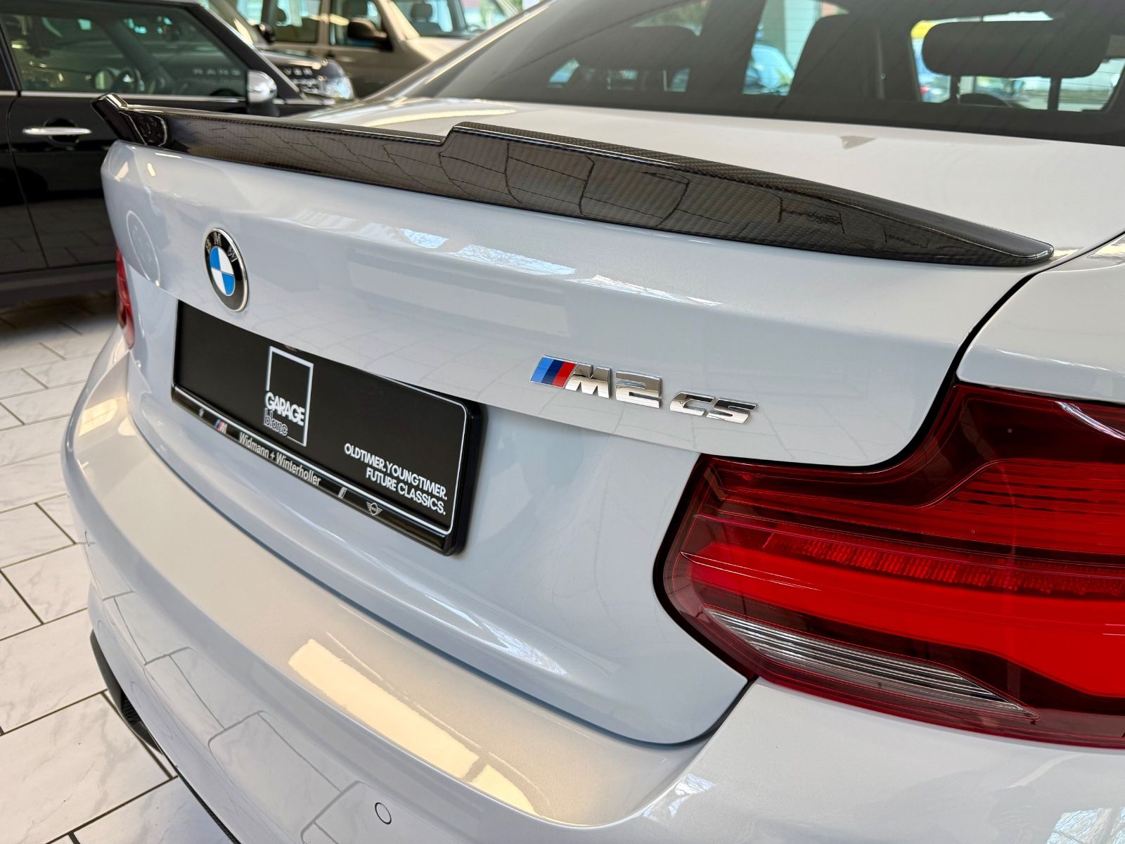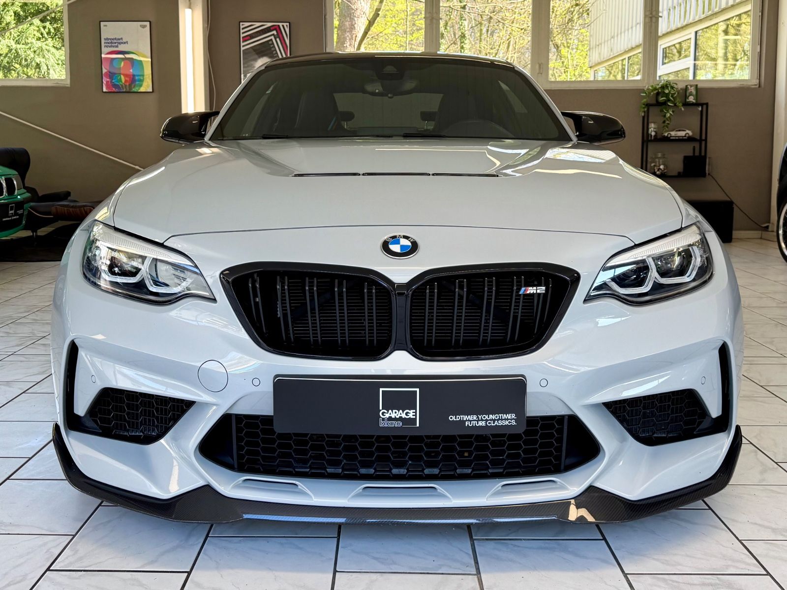 Die erste Generation des BMW M2 war das bis dato erfolgreichste High-Performance-Modell der M-GmbH - bullige Optik, potenter Motor und knackige Abmessungen trafen auf Anhieb den Nerv der Zielgruppe. Mit dem M2 Competition ab 2018 hielt dann mit dem S55-Triebwerk die reine M-Technik Einzug, der M2 wurde engültig zur spannenden Alternative auch zum M4.Im guten Geist der CS/CSL/GTS-Sondermodelle entstanden dann von März bis September 2020 streng limitiert 2200 Exemplare des M2 CS - und nicht nur angesichts heftiger 30000,- EUR Aufschlag zum "normalen" Competition hieß es Luft anhalten: in Manufaktur-Qualität entstand eine Motorsport-Variante, die schon alleine mit umfassendem Carbon-Einsatz (Splitter, Diffusor, Heckspoiler, vollständige Motorhaube und Dach im Zielflaggen-Design) keinen Zweifel an ihrer Ernsthaftigkeit zuließ. Gerade in Kombination mit einer hellen Lackierung wie "Hockenheim-Silber" entsteht so ein starker Kontrast - in perfekter Verarbeitung.