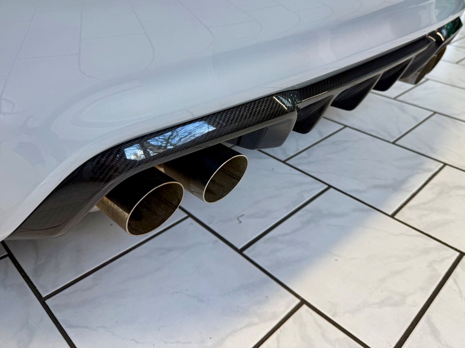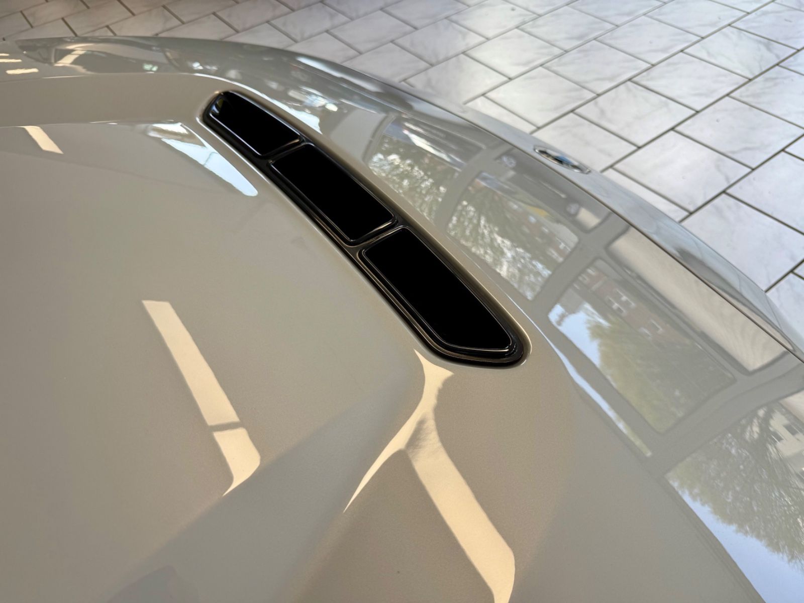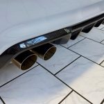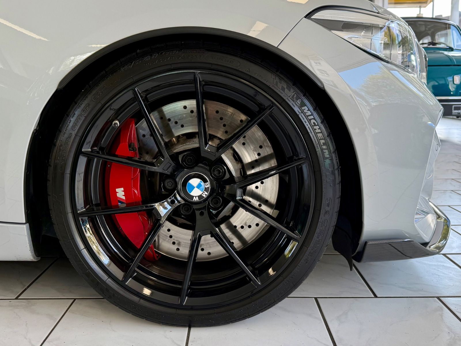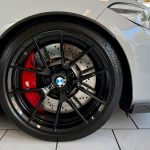 Durch die schwarzen Speichen 19-Zoll-Räder bleibt der Blick hängen an einer 6-Kolben-Festsattel-Bremse mit 400mm-riesigen Bremsscheiben, auch hier eine deutliche Differenzierung zur auch schon nicht unterdimensionierten Serien-Anlage.