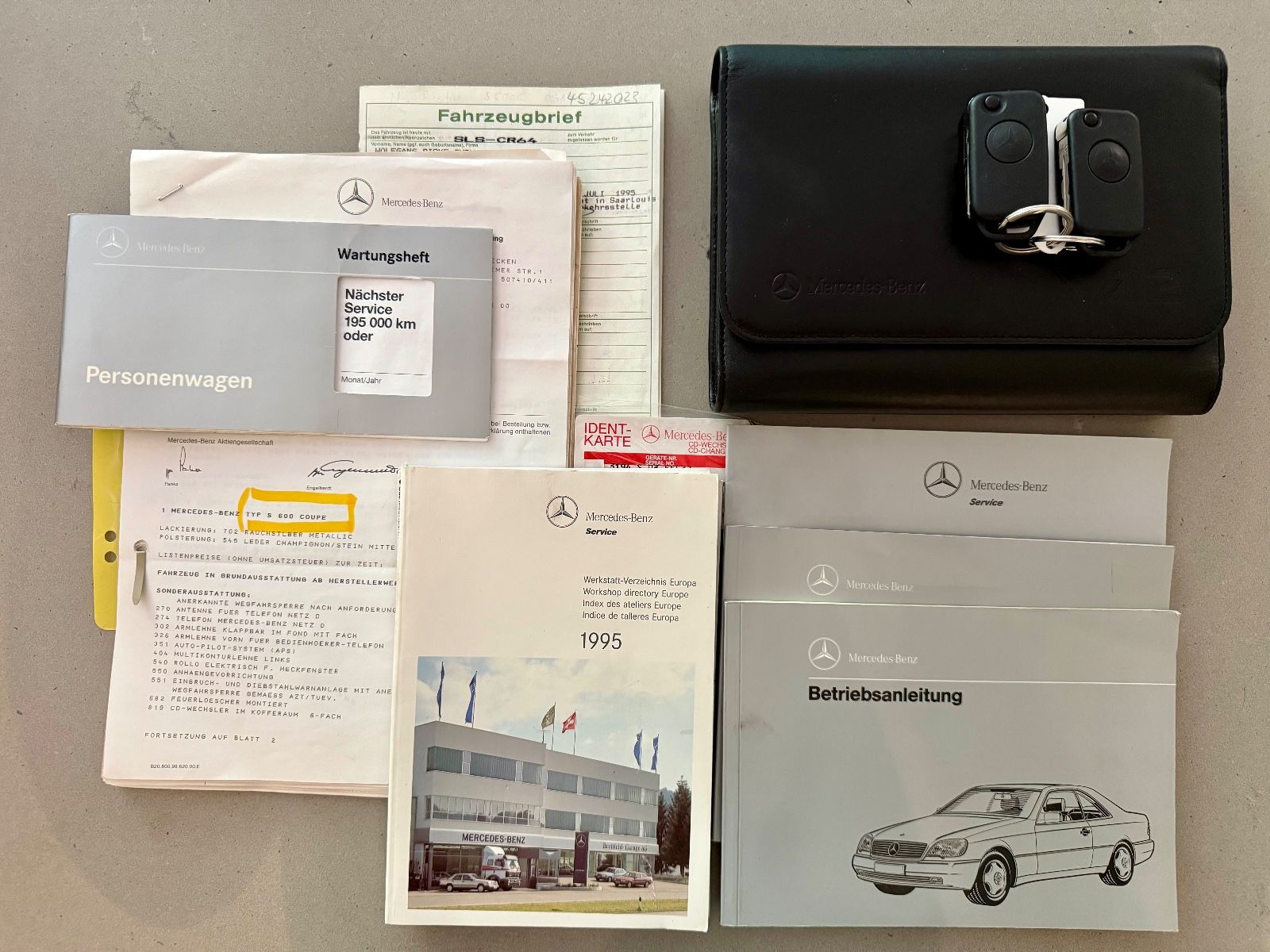 Umso glücklicher dürfen wir hier heute ein echtes Unikat präsentieren, am Markt aktuell einmalig: ein S600 Coupé aus deutscher Erstauslieferung. Am 19.07.1995 übernahm ein Gewürzfabrikant sein neues Coupé bei Mercedes Benz Th. Kreuzer in Saarlouis. Zahlreiche Dokumente wie Bestellung, Auftragsbestätigung etc. zeugen auch davon, dass er ursprünglich einen S500 zu 176.015,- DM geordert hatte, sich dann aber doch (als Barkäufer) den Zwölfzylinder gönnte. Inklusive der gewählten Sonderausstattungen, u.a. dem brandneu lieferbaren Navigationssystem APS, Schiebedach, CD-Wechsler usw., standen nun 233.639,75 DM auf der Rechnung!