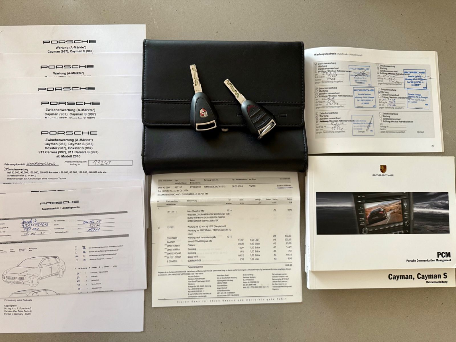 Wir dürfen nun hier einen Cayman 2.9 präsentieren, wie er sein soll: vor mehr als 11 Jahren erwarb der Eigentümer, ein senioriger Siemens-Ingenieur, das Fahrzeug im Porsche Zentrum Nürnberg als jungen Gebrauchten mit rund 30tkm. In diesem PZ wurde er nicht nur erstmal ausgeliefert, sondern auch bis heute ausschließlich gewartet (zuletzt eine Große Wartung in 2024 bei 95750 KM). Alle Wartungsberichte sind ebenso wie Bordmappe, Serviceheft und Schlüssel vorhanden, so wie es sein soll. Seinen Garagenplatz hat er sich mit einem Macan für die weniger sonnigen Tage des Lebens geteilt.