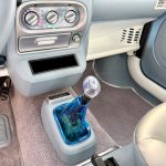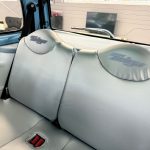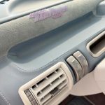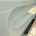 Alle üblichen Kunststoff-Teile sind mit himmelblauem Nappa-Leder bezogen, ausgeführt mit akkuraten Ziernähten. Das Fahrzeug wurde dann vollständig zweifarbig in Perlmuttlackierung lackiert, bis hin zu jeder Leiste und jeder Blende.