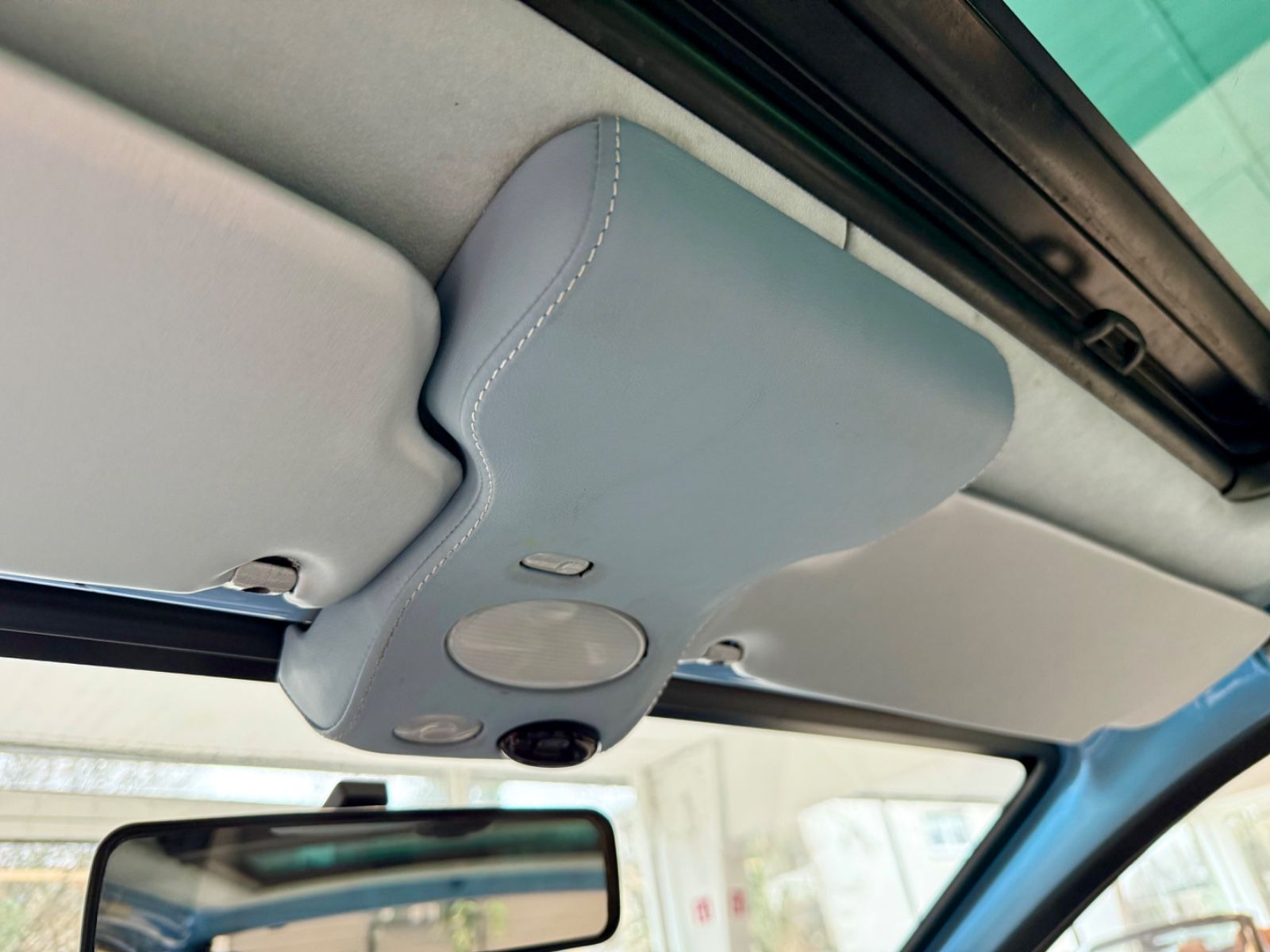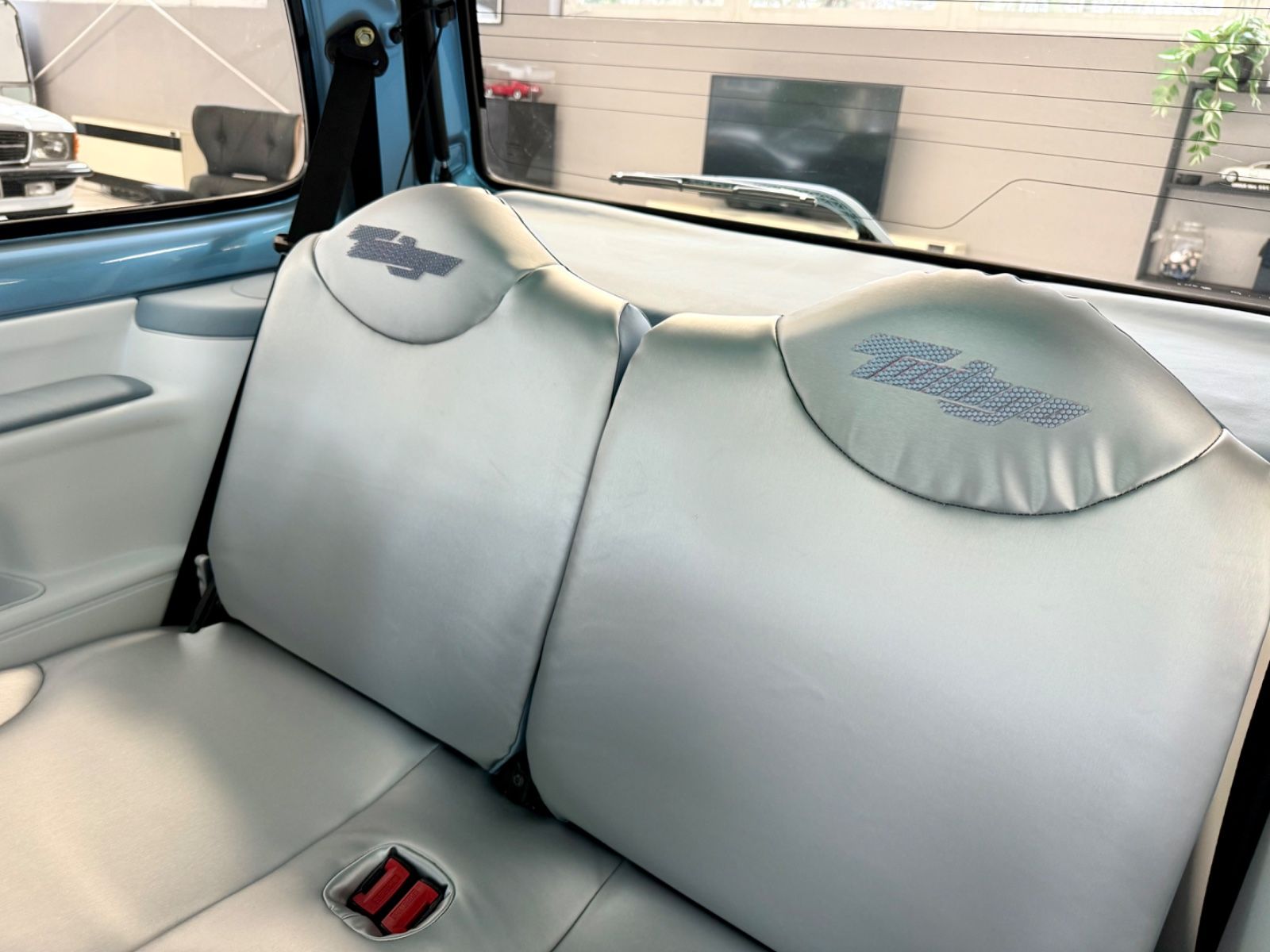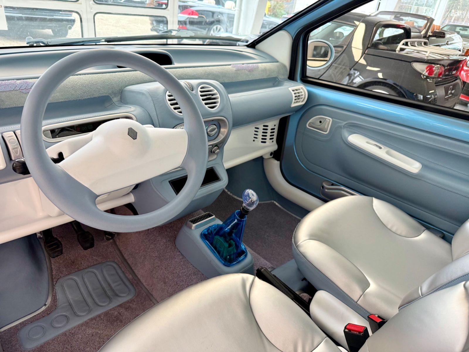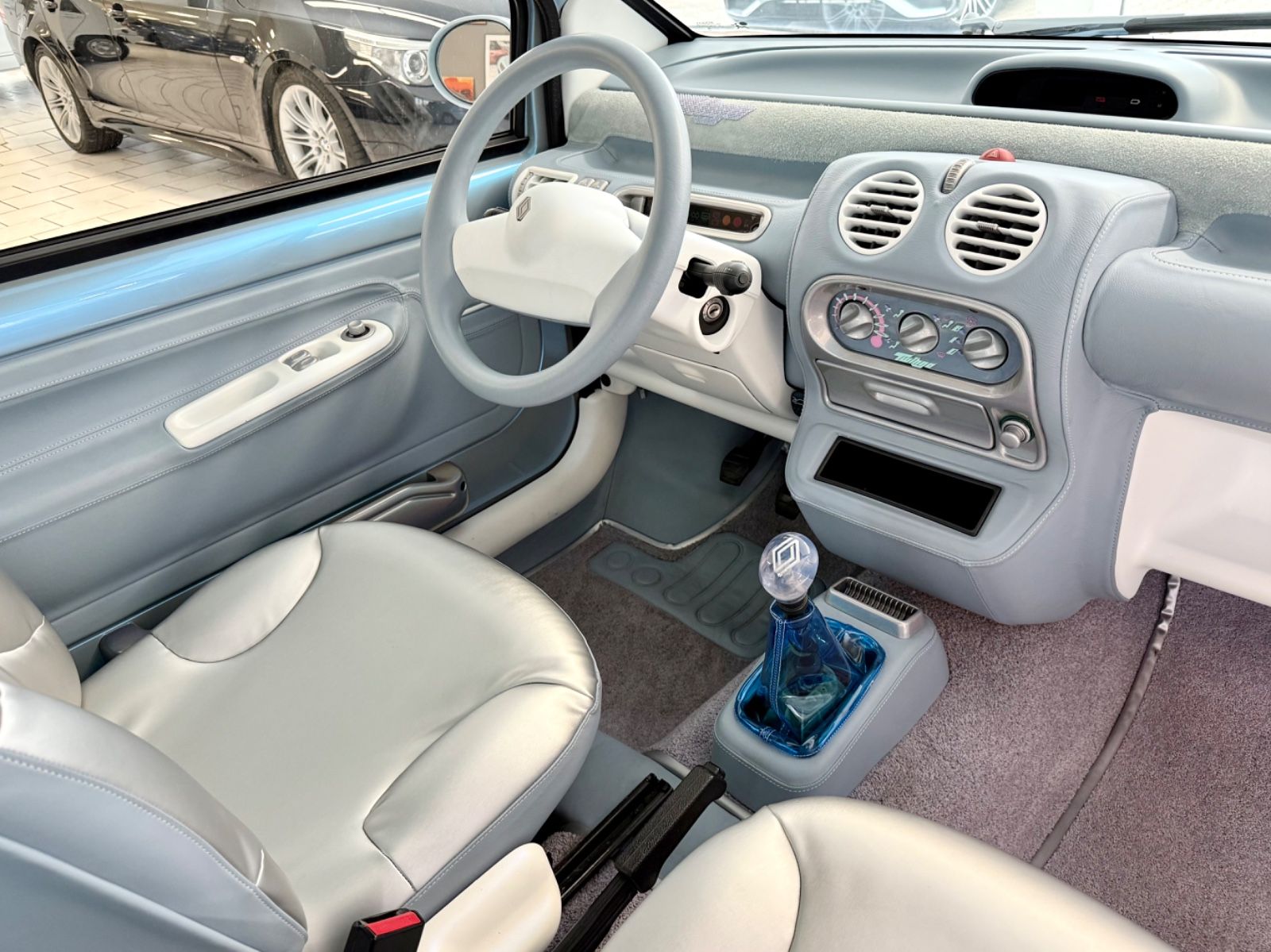 Alle üblichen Kunststoff-Teile sind mit himmelblauem Nappa-Leder bezogen, ausgeführt mit akkuraten Ziernähten. Das Fahrzeug wurde dann vollständig zweifarbig in Perlmuttlackierung lackiert, bis hin zu jeder Leiste und jeder Blende.